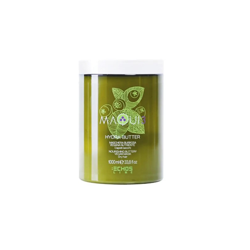 ECHOSLINE Maqui 3 Hydra Butter Maschera - Capelli Secchi e Trattati 1000ml Maschera Burrosa Vegana Nutriente Per capelli secchi La sua formula compatta e burrosa, arricchita con prezioso Burro di Karitdalle proprietemollienti, condiziona e nutre in profonditil capello secco e disidratato, rendendolo vitale e brillante. ll capello risulta idratato, setoso e facile da pettinare. 100 % Vegan 99% ingredienti naturali 96% biodegradabile Senza solfati, siliconi e parabeni MODO D'USO Dopo lo shampoo, applicare una noce di prodotto a capelli tamponati, distribuire uniformemente su lunghezze e punte e pettinare. Lasciare in posa 5 minuti, quindi risciacquare.