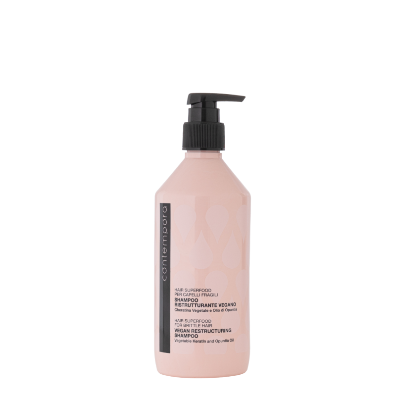 Shampoo specifico per capelli fragili, sfibrati e opachi. Aumenta la quantitdi cheratina nella fibra, proteggendola da danni ulteriori. Ad azione idratante, lascia i capelli visibilmente rigenerati e leggeri. Rafforza i capelli dallinterno, migliorando la resistenza alla rottura e apportando corposit Ravviva la brillantezza. Indicato per capelli sia grossi che fini. Contempora Shampoo Ristrutturante arricchito con Cheratina Vegetale, una tecnologia naturale basata su peptidi derivati da Pisello, Riso e Soia, e Olio di Opuntia, un ingrediente estremamente sostenibile e a bassissimo impatto ambientale.